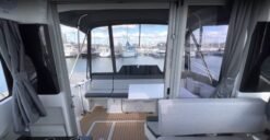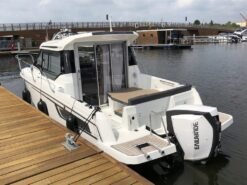 Under the Jeanneau 795 powerboat console, there is space for a cabin (with a sea toilet and a small washbasin – not in standard specifications), a small one, but even taller people (about 190 cm) can fit there relatively comfortably. Inside Fisher boat, there are a lot of shelves and lockers in all possible places. Thanks to the wide-opening rear doors, sliding windows on both sides and a large sunroof in the roof we have excellent ventilation and a wonderful view on all sides of the water from your Merry Fisher 795 S2 boat in this year (please search more information about our new and used boats with similar dimensions for the best price on dedicated pages of this website).
