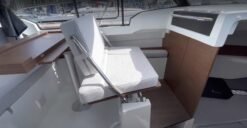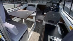 Take a look at an interior of the Merry Fisher 795 for sale UK which is accessed from the aft cockpit through a three-winged door, which is widely sliding to the side– all in the standard equipment of the Jeanneau Merry Fisher 795 which price starts from around EUR 47,000 net + price for the Yamaha outboard motor and extra options. Right on the right-hand side of the entrance, there is a cabinet which contains a mini-cabinet (stove and sink), shelves and storage compartments, beverage holders and a 220 V socket. These Fisher boats in the front part of their cabinet have also a support for the remote control armchair.