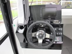 In one of the configurations, you can select the additional remote control seat and a second remote control, a total of three comfortable seats independent of each other. Devices such as fridge, sink and cooker are thoughtfully integrated into the cabin interior (space is not as comfortable as in a cabin cruiser powerboat). In front of the wheelhouse, there are doors leading to the WC and comfortable mattresses for rest.